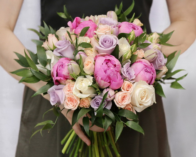 півонія 5 шт., троянда Кенія кущ 60-70 см 10 шт., троянда Кенія 35-40 см 9 шт., троянда 60 см 11 шт., тюльпан 9 шт., рускус, стрічка 3 шт.
