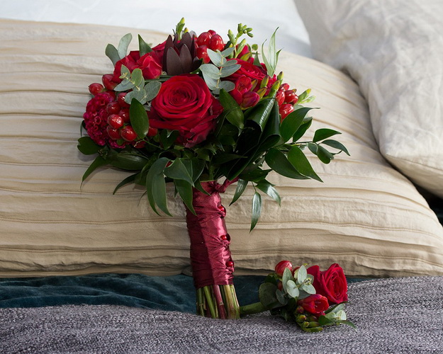 Яскравий букет для сміливих неординарних дівчат. Пишні бутони троянд виглядають особливо ефектно серед зелені. Яскраво-червоні квіти символізують пристрасть і любов. А бутоньєрка в тому самому стилі підкреслить особливий зв'язок між коханими.