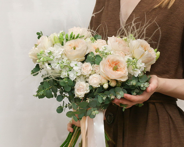 Cклад: троянда піоноподібна 7 шт., матіола 7 шт., фрезія 7 шт., троянда Кенія кущ. 70 см 7 шт., ковила 0,3 шт., евкаліп, стрічка 3 шт.
