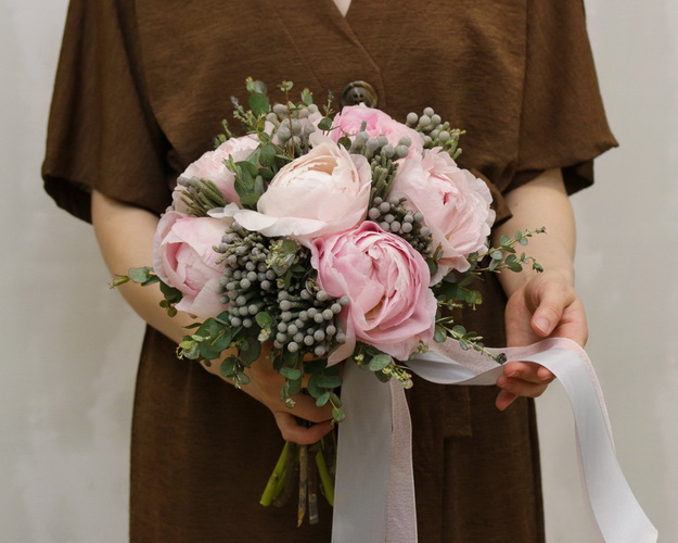 Cклад: півонія 9 шт., каапс 10 шт., Евкаліпт 0,5 шт., Стрічка 3 шт.