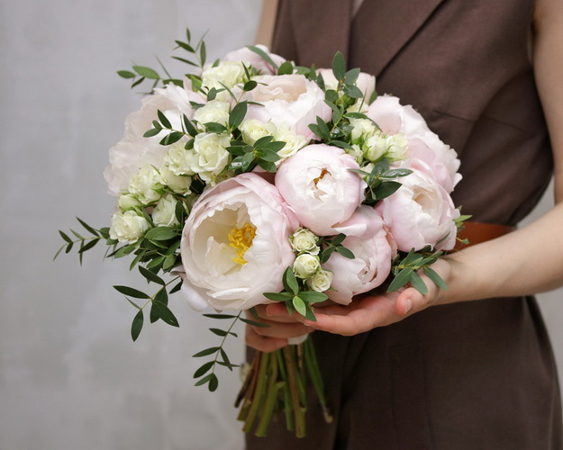 півонія 9 шт., Троянда кущова 60-70 см 10 шт., Евкаліпт (банч), стрічки 3 шт.