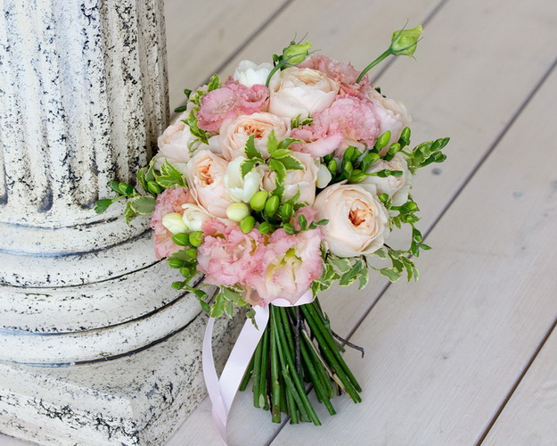 Cклад: фрезія 10 шт, піоноподібна троянда 9 шт, лізіантус 5 шт, піттоспорум, стрічка атласна 1 шт.