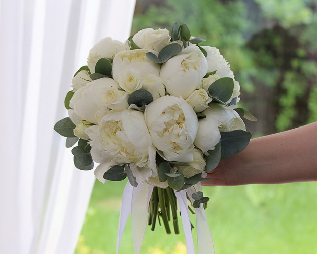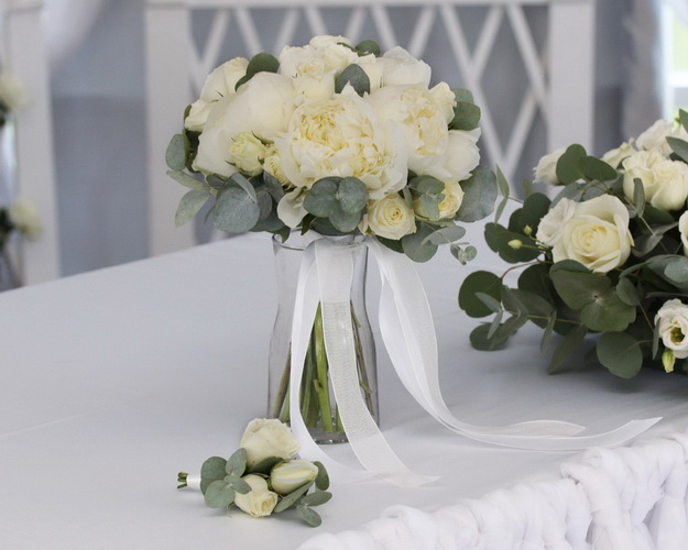 Cклад: півонія 9 шт., троянда Кенія кущ. 70 см 10 шт., Евкаліпт, стрічка 3 шт. Бутоньєрка входить у вартість букета. Композиції на стіл нареченого оплачуються окремо.