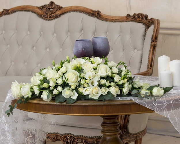 Вишукана прикраса для весільного столу – композиція з білих троянд, фрезії та евкаліпту. Немов ніжна, ароматна хмара. Композиція надасть будь-якому приміщенню урочистого вигляду.
