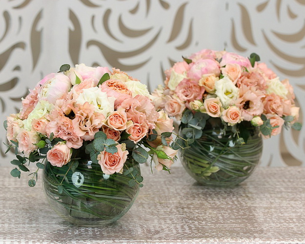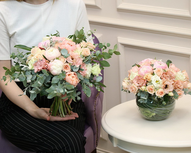 Cклад: півонія, лізіантус, троянда кущова, цинерарія, евкаліпт, стрічка.Ціна вказана за одну композицію. Букет оплачується окремо.