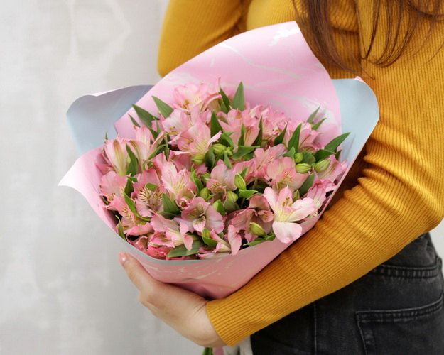 Букет із 15 рожевих альстромерій у стильній упаковці.