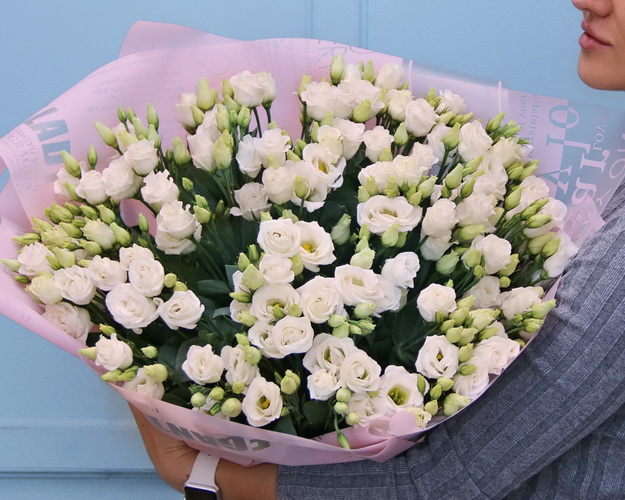Пишний букет з білих лізіантусів стане чудовим подарунком до дня народження, річниці, ювілею, дня весілля чи заручин. Чистота кольору та свіжість бутонів підкреслена стильним оформленням.