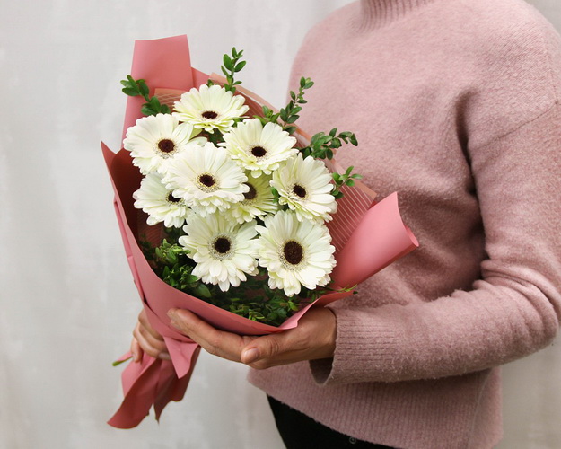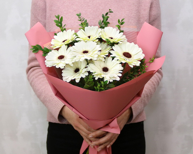 Букет із 9 білих міні гербер у стильній упаковці із зеленню