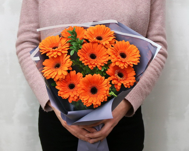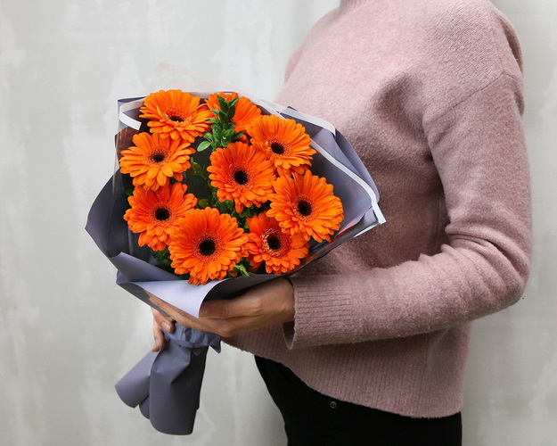 Букет з 9 помаранчевих міні гербер у стильній упаковці із зеленню