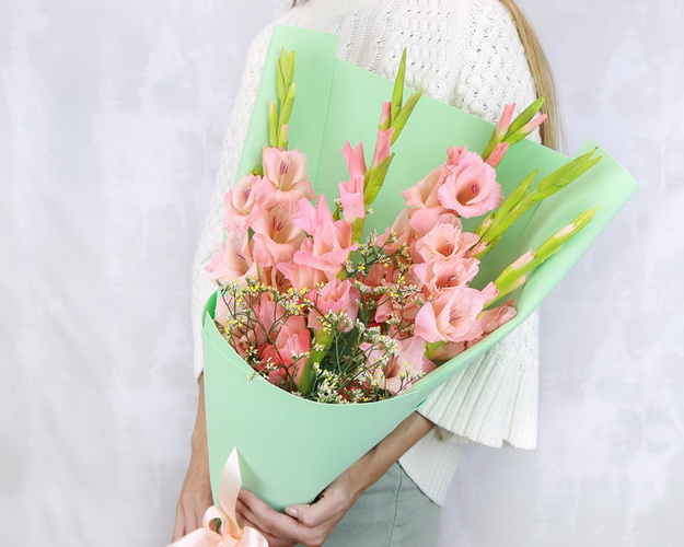 Букет з 5 гладіолусів та зелені у стильній упаковці.