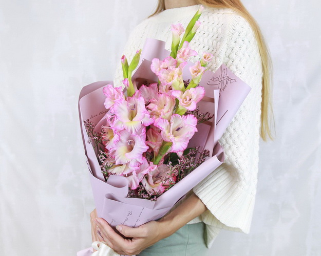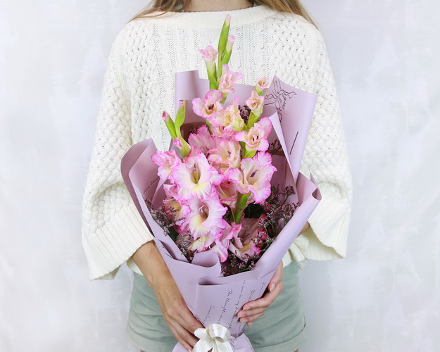 Cклад: гладіолус 5 шт., Лимоніум 1 шт., Плівка 1,5 шт., Стрічка 1 шт.