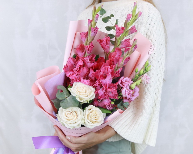 Cклад: гладіолус 3 шт., троянда Еквадор 40-50 см 3 шт., лізіантус 1 шт., евкаліпт 0,3 шт., Плівка 2 шт., Стрічка 1 шт.