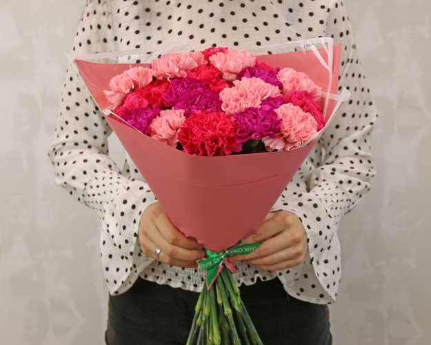 Cклад: діантус (гвоздика) стандарт 25 шт., Плівка 2 шт., Стрічка 1 шт.