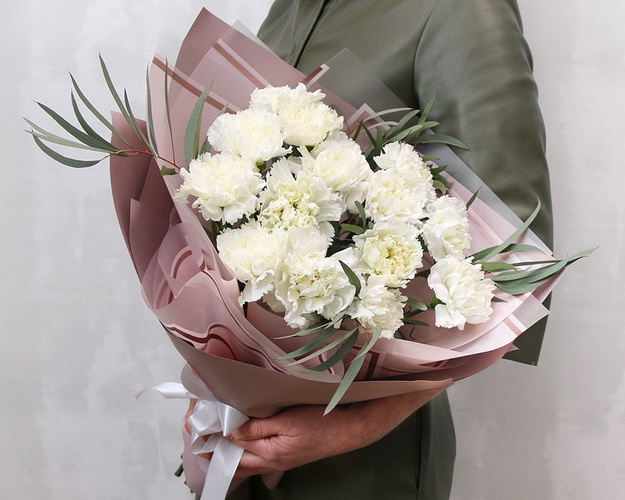 Букет із 15 білих гвоздик у стильній упаковці із зеленню