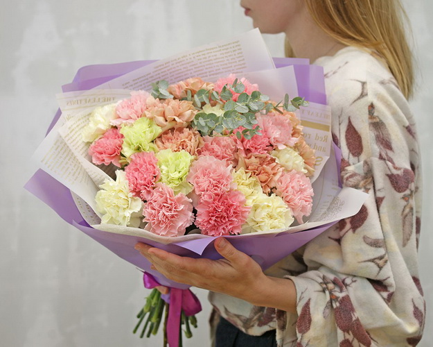 Букет з 25 діантусів мікс із зеленню в дизайнерській упаковці