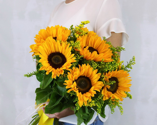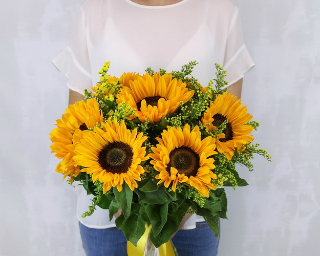 Веселі соняшники створені для того, щоб дарувати радість і гарний настрій. Ця чудова композиція огорне вас солодким медовим ароматом і надовго прожене зневіру та нудьгу.