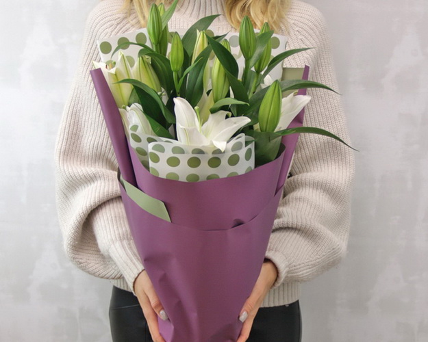 Букет із 3 білих орієнтальних лілій в упаковці.