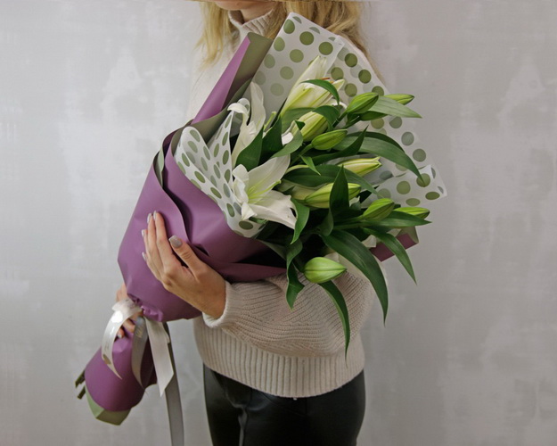 Cклад: лілія орієнтальна 3 шт., Плівка 1,5 шт., Стрічка 1 шт.