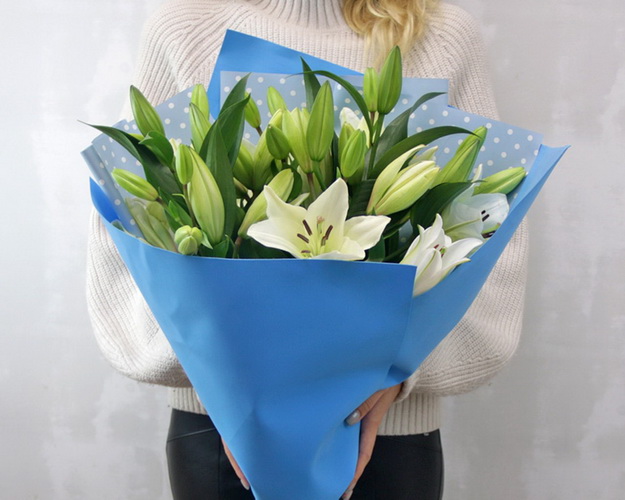 Cклад: лілія орієнтальна 7 шт., Плівка (фаміоран) 3,5 шт., Стрічка 1 шт.