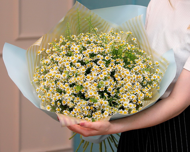 Пухнаста і світла хмара ромашок порадує всіх, хто цінує природність. Скромна чарівність цих кольорів нікого не залишить байдужим, завжди викличе усмішку та приплив позитивних емоцій.