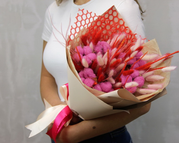 Cклад: бавовна 5 шт., ковила 0,5 шт., сухоцвіт 1 шт., лагурус 3 шт., тишею, плівка 1,5 шт., стрічка 1шт.