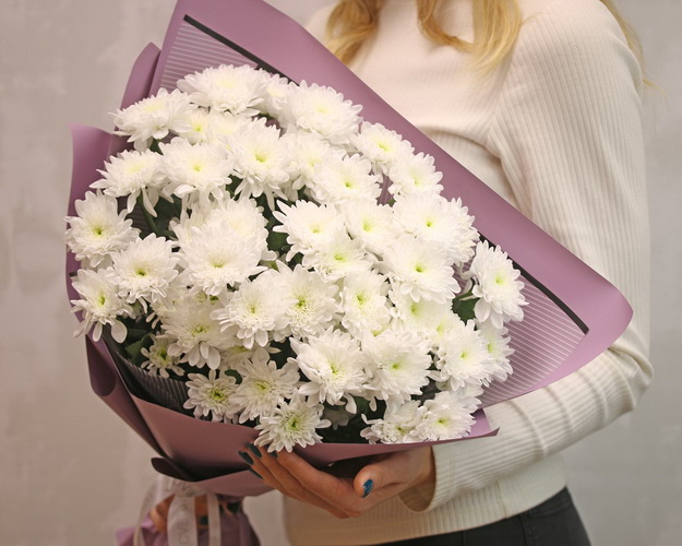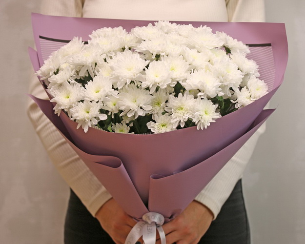 Букет із 15 білих кущових хризантем у стильній упаковці.