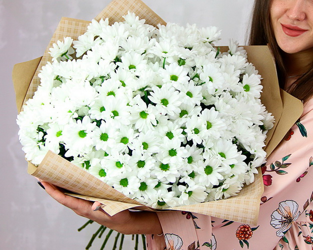 Букет із 25 білих кущових хризантем у стильній упаковці.