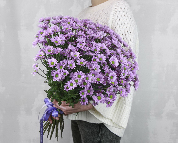 Букет із 25 фіолетових кущових хризантем під стрічку