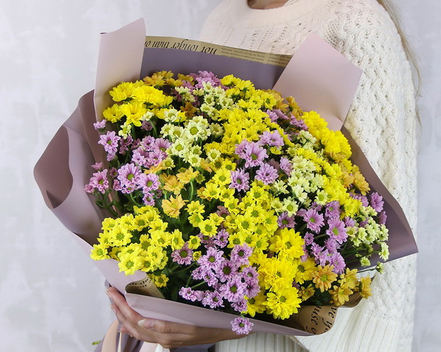 Яскравий букет із жовтих та рожевих хризантем – чудовий подарунок до дня народження, ювілею, професійного свята. Та й без приводу такий букет стане джерелом радості та безлічі посмішок.
