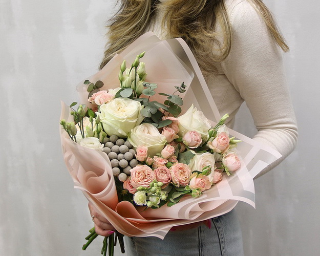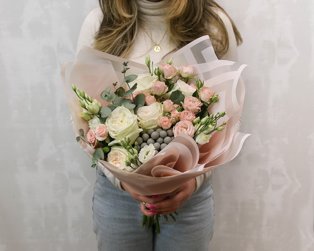 троянда Еквадор 50-60 см 1 шт., троянда Бомбастик 2 шт., каапс 1 шт., Лізіантус 2 шт., Плівка 1,5 шт., Стрічка 1 шт. Букет розміром M.У букеті є сезонні квіти - вони можуть бути замінені на аналогічні за вартістю із збереженням концепції букета. Ці ціни діють при оформленні замовлення на сайті.