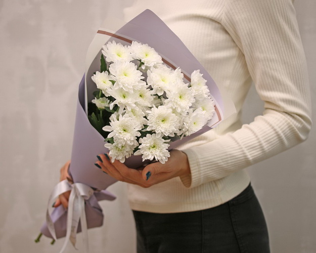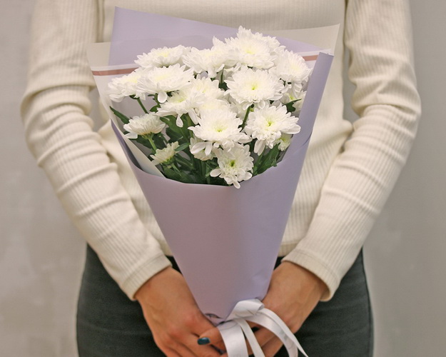 Букет із 3 білих кущових хризантем у стильній упаковці.