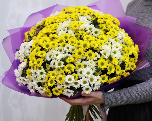 Cклад: хризантема кущова Сантіні 49 шт, матова плівка 3 шт, стрічка атласна 1 шт.