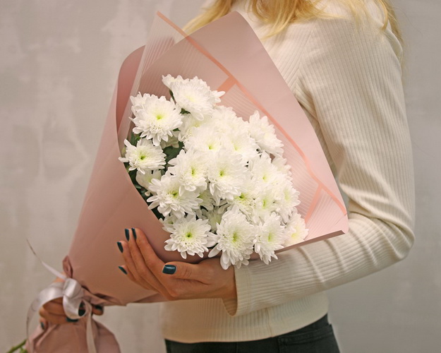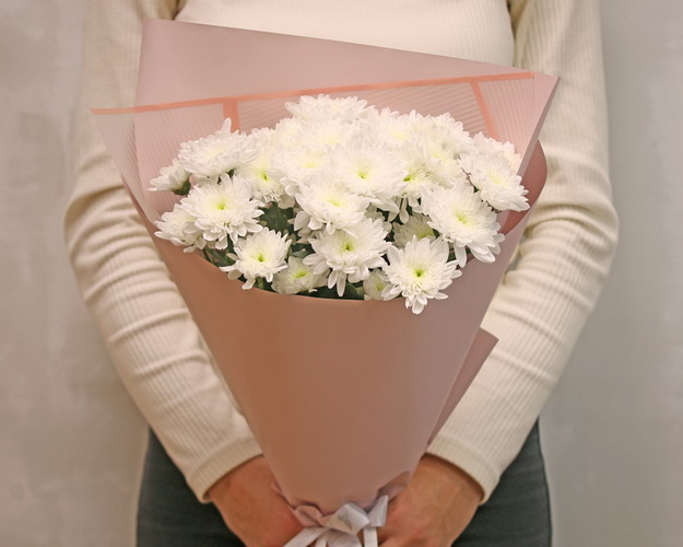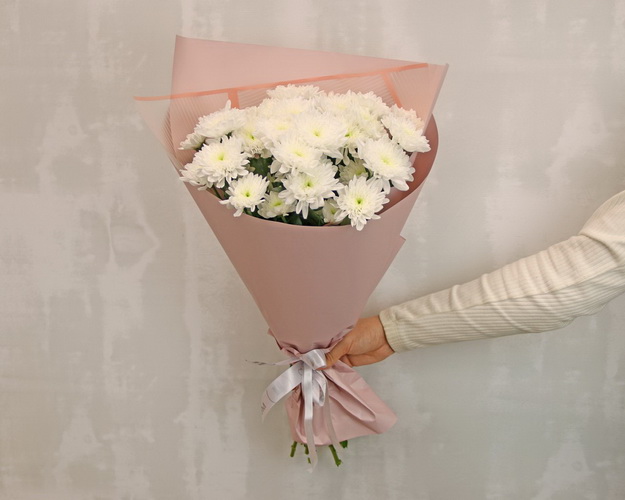 Букет із 5 білих кущових хризантем у стильній упаковці.