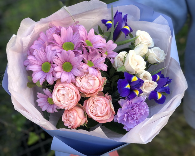 Cклад: Хризентема 1 шт., Кущова піоновидна троянда 1шт., Ірис 3 шт., Кущова троянда 1шт., Гвоздика 1 шт., Плівка 1,5 шт., Стрічка 1 шт.