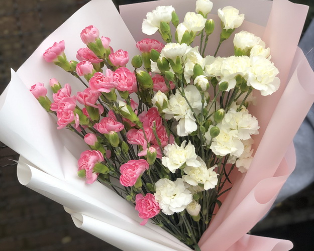 Букет із 13 білих та рожевих гвоздик в стильній упаковіці