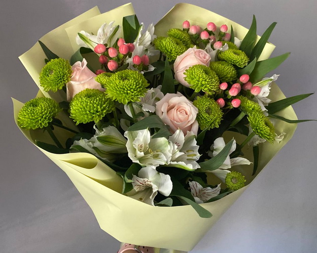 Cклад: Гіперікум 3 шт., Хризентема 4 шт., Альстромерія 4 шт., Троянда 3 шт., Плівка 1,5 шт., Стрічка 1 шт.