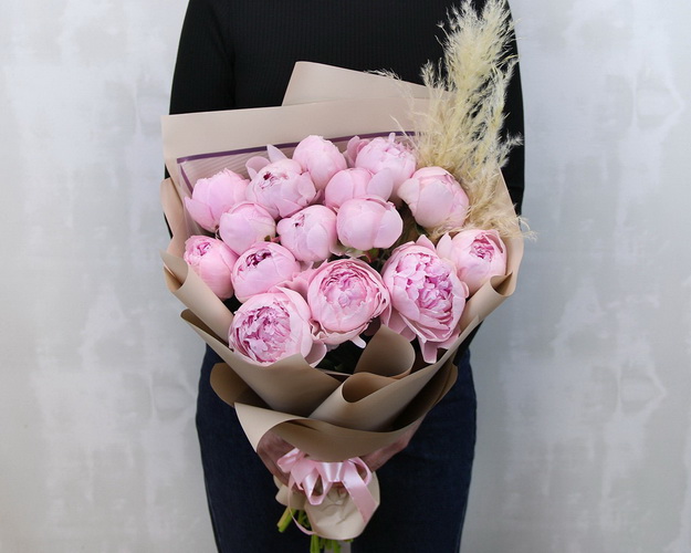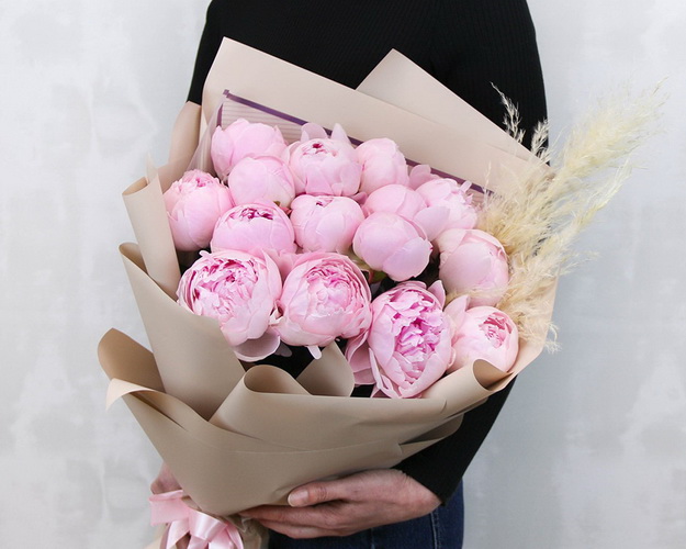 Букет з рожевих півонії – чудовий подарунок для коханої людини. Ароматні бутони ніжного відтінку розкриваються поступово, набуваючи все більш урочистого вигляду, радуючи вас своєю красою та свіжістю.