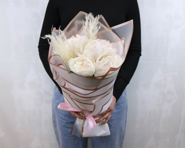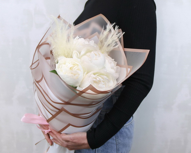 Cклад: півонія 5 шт., Пампасна трава 0,2 шт., Плівка дизайнерська 1 шт., Стрічка 1 шт.