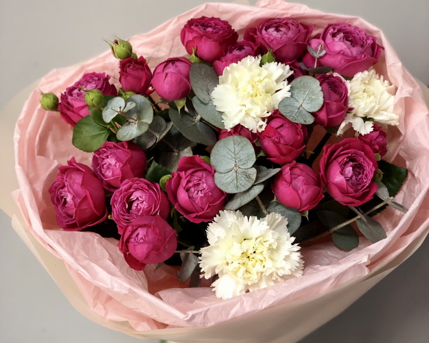 Кущова піоновидна троянда 4 шт., Гвоздика 3 шт., Зелень, Плівка 1,5 шт., Стрічка 1 шт.